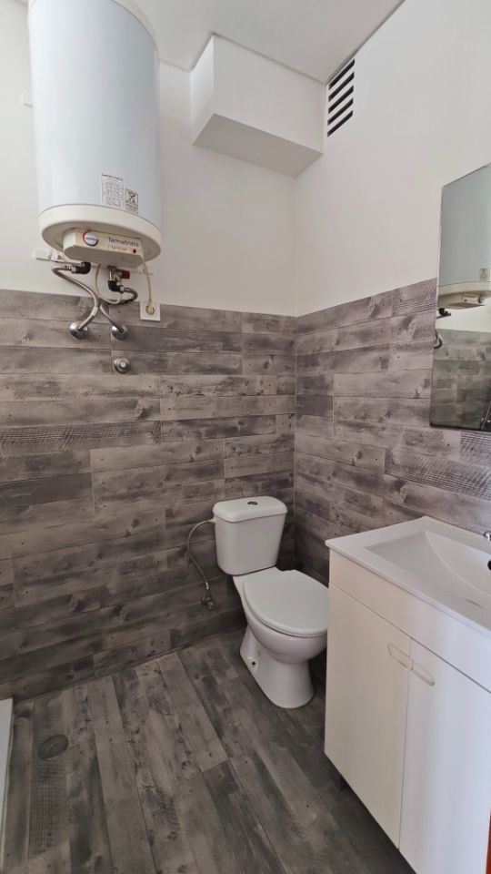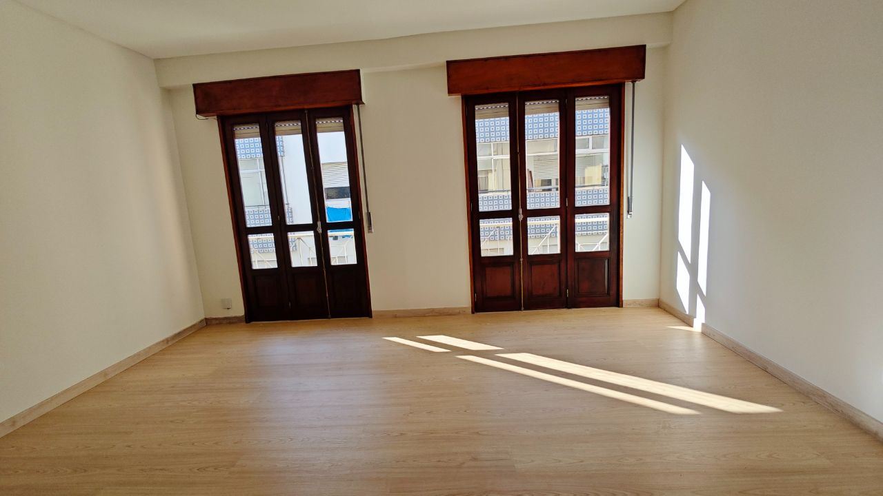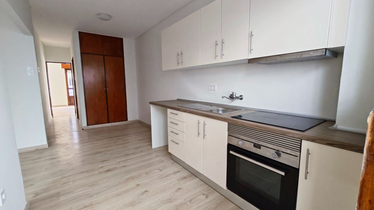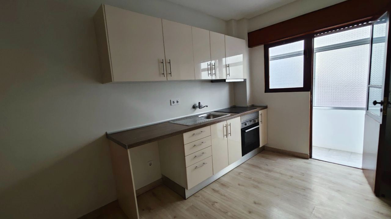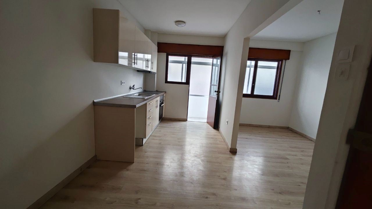 Andar T-1, constituído por uma sala e cozinha com placa de fogão e forno eléctrico, uma lavandaria, uma casa de banho completa, um quarto e uma varanda.