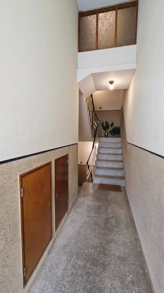 Fica no 1º andar, em prédio habitacional sem elevador.